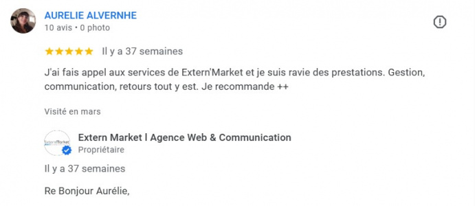 EXCELLENT Basée sur 74 avis Publié sur Vi BamTrustindex vérifie que la source originale de l'avis est Google. Excellente collaboration avec cette agence pour la création de notre site web ! Ils ont fait preuve d'une grande écoute et ont été très adaptables à nos besoins. Nous avons particulièrement apprécié leur force de proposition et le temps qu'ils nous ont consacré tout au long de ce projet un peu technique. Je recommande vivement leurs servicesPublié sur adik manjerTrustindex vérifie que la source originale de l'avis est Google. J'ai fait appel aux services de cette agence en 2022 car j'avais un énorme bug technique sur mon site web. L'équipe a su remettre mon site d'aplomb très rapidement (alors que 2 autres agences n'y sont pas arrivées...). En 2023, je leur confie mon Référencement SEO et la j'ai développé mes ventes en ligne. J'apprécie le conseil, l'accompagnement et le sérieux de l'équipe ! Pour l'ensemble de ces raisons depuis maintenant 3 ans, je vous recommande chaleureusement l'agence digitale Extern MarketPublié sur Nabil NedjarTrustindex vérifie que la source originale de l'avis est Google. Merci Sandy pour ton professionnalisme et ta bienveillance. Plus de 3 ans et deux sites internet .. Je suis plus que ravie de notre collaboration. Je recommande vivement.Publié sur Henras ClaireTrustindex vérifie que la source originale de l'avis est Google. Très satisfaite de cette agence, je recommande. Une collaboration depuis bientôt 7 ans, toujours à l'écoute, très réactive et surtout un travail très pertinent sur le référencement et la stratégie digitale. Merci encore pour votre professionnalisme.Publié sur Emmanuel JanelTrustindex vérifie que la source originale de l'avis est Google. Je recommande cette agence pour son sérieux dans la gestion de la communication. Une accompagnement personnalisé sur mesure pour la gestion de la sécurité, le suivi de ma stratégie digitale et ,l'optimisation de mon référencement SEO. A l'écoute, professionnel et très pointu sur le marketing digital. Je suis totalement satisfait de cette agence de communication et je ne peux que les recommander dans leur sérieux. Vraiment merci pour votre aide ! EJPublié sur Christine AscoTrustindex vérifie que la source originale de l'avis est Google. Pro et bons conseils !Publié sur Maja ÅkessonTrustindex vérifie que la source originale de l'avis est Google. Très satisfait des services de cette agence web. Elle m'a été recommandé par un client pour le sérieux et l'expertise en référencement SEO. La communication est fluide, précise et ponctuelle. Les conseils donnés sur le marketing digital sont pointus. Dès le 3ème mois, nous constatons des résultats probants. Merci pour votre implication et professionnalisme.Publié sur lesflorent inesTrustindex vérifie que la source originale de l'avis est Google. Bonjour, l'agence Extern’Market à boosté ma visibilité sur le net. La gestion de notre fiche Google My Business a été complètement modifiée, grande force rédactionnel et de référencement avec mot clés. En 3 mois, ma visibilité sur le web à complètement changé et mon chiffre d'affaires a été augmenté de façon considérable. Encore un grand merci à vous. Ce sont des magiciens du web !!Publié sur Christelle VillardTrustindex vérifie que la source originale de l'avis est Google. Je collabore avec Extern' Market depuis plusieurs années. De la formation, à la création de notre site , la régie Marketing ... Des conseils pertinents, un bon suivi de l'évolution de notre site Avec comme résultat une visibilité croissante sur le Web constante Extern’ Market propose un accompagnement très personnalisé et professionnelPublié sur sabrina louhTrustindex vérifie que la source originale de l'avis est Google. Travail sur le référencement local et la gestion de la E-réputation. Je recommande cette agence pour leur sérieux et réactivitéCertifié par: TrustindexLe badge vérifié de Trustindex est le symbole universel de confiance. Seules les meilleures entreprises peuvent obtenir le badge vérifié, avec une note supérieure à 4.5, basée sur les avis des clients au cours des derniers 12 mois. En savoir plus